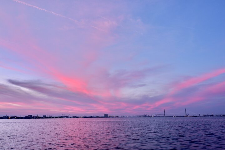 Experience the beautiful sights and sounds of the Charleston harbor and surrounding waterways aboard our 45-foot USCG certified power catamaran as Charleston’s unique skyline comes alive with peaceful and breathtaking views of sunset silhouetted steeples. Dolphins and shore birds will entertain you with their whimsy. You'll enjoy seeing sites such as the forts, the Battery, the islands and the lighthouses. See the Arthur Ravenel Jr. Bridge from a different perspective as we cruise under it. This is not a guided tour. However, our captain and mate are prepared to answer any questions that you may have. Soft drinks, beer and wine are available for purchase.